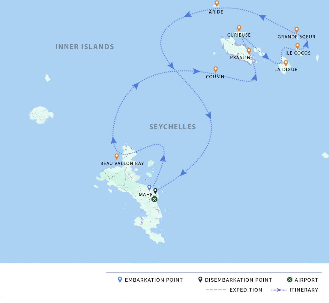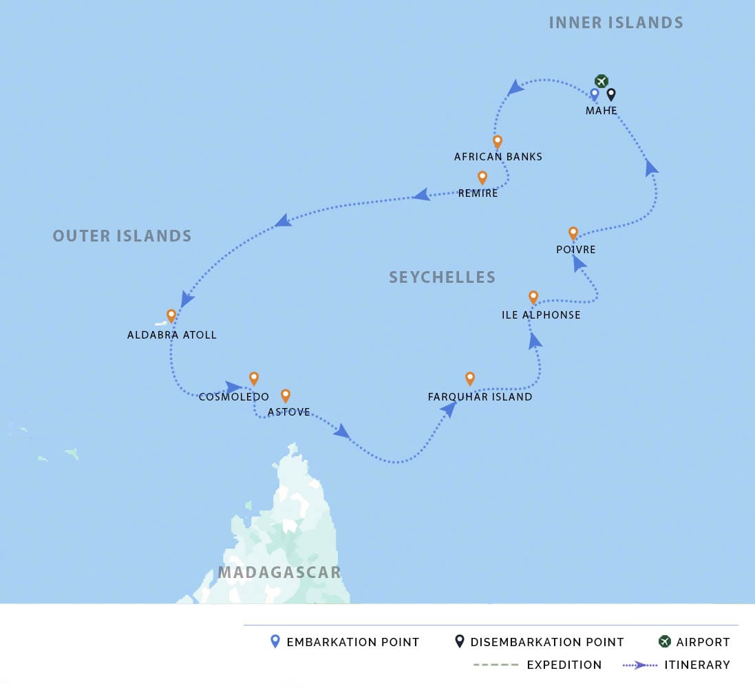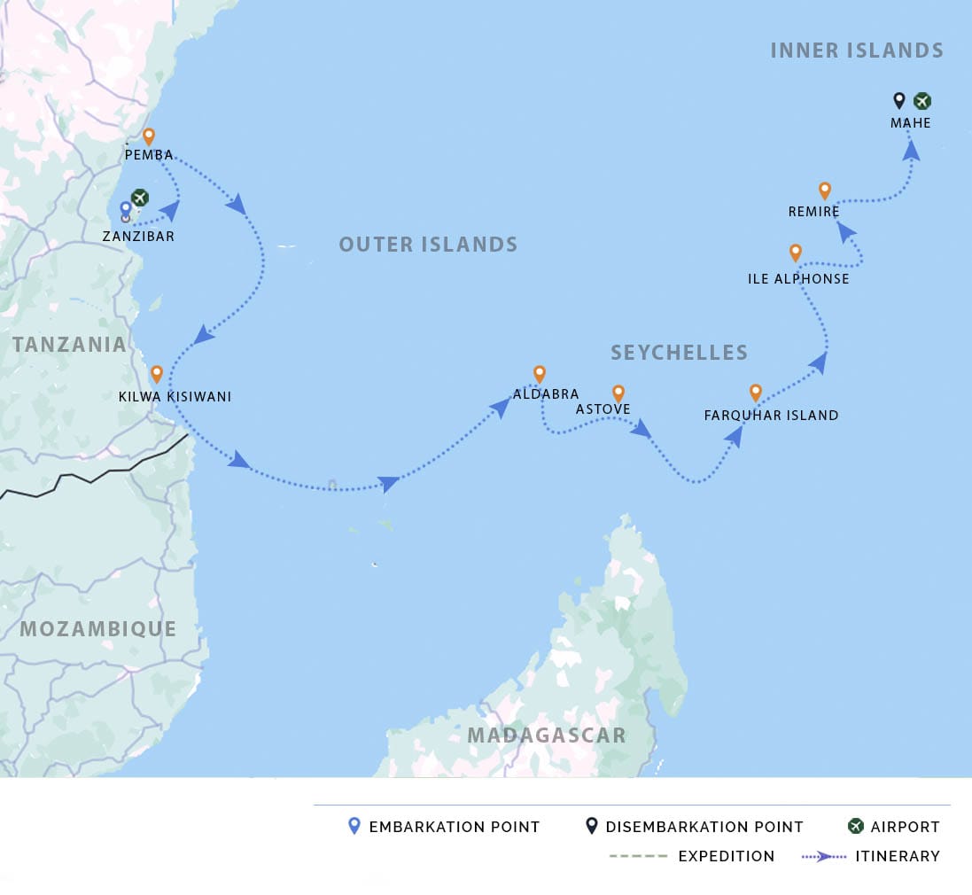 Aqua Lares sails 5-, 9-, 10-, 11-night, and 14-night expeditions across the Seychelles, Aldabra Atoll, Zanzibar, and the Tanzanian coast. Shorter voyages focus on the idyllic inner islands and coral reefs of the Seychelles, while longer journeys extend to the outer islands and the cultural shores of East Africa.