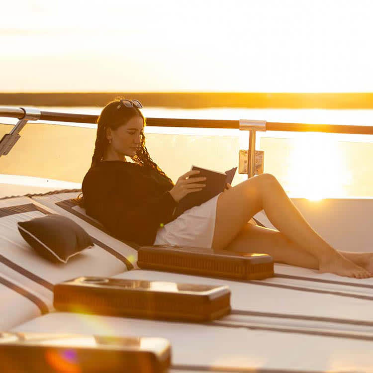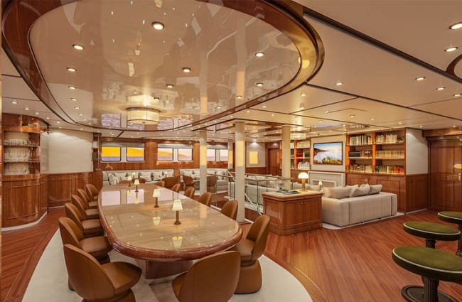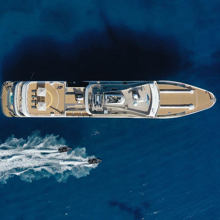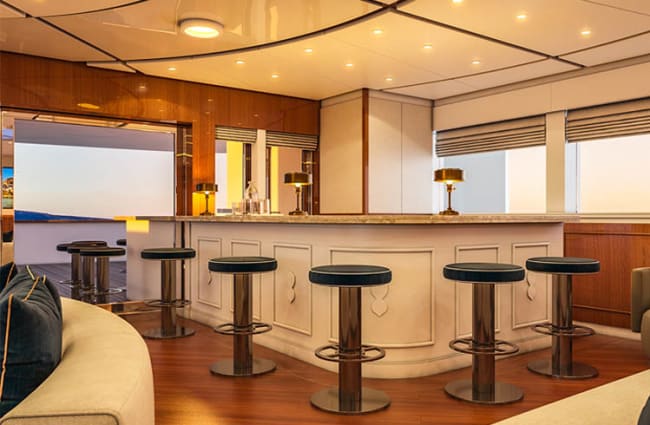 Guests unwind across six decks of refined spaces — an infinity plunge pool with panoramic views, open-air lounges, a spa and sauna, a gym, and a cinema. Social areas feel intimate and relaxed, inviting conversation, contemplation, and connection to the sea.