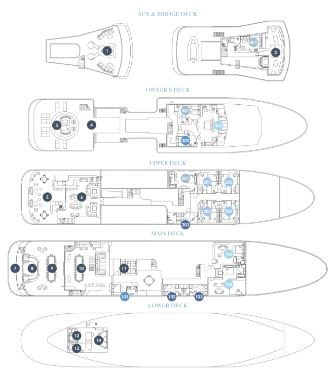 Elegant, airy, and thoughtfully designed, Suite 105 offers a private sanctuary on the Main Deck. With space for up to four guests, the suite features a plush double bed and a convenient double Murphy bed — perfect for families or small groups traveling together. Three large window fill the room with natural light, enhancing its warm and welcoming atmosphere.