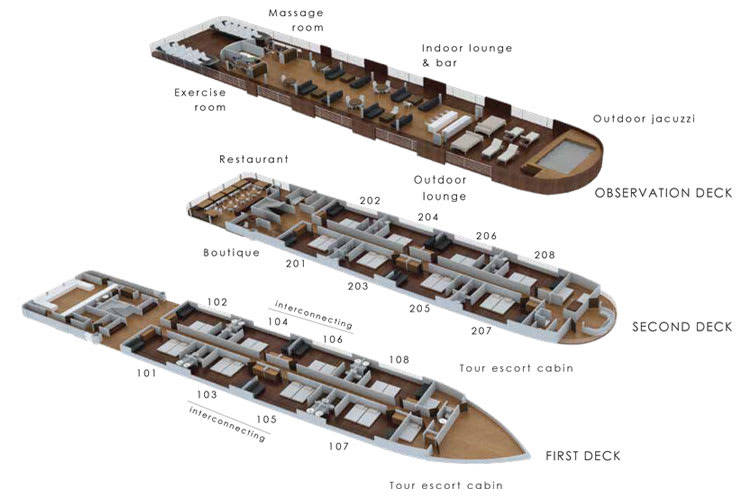 These spacious suites are designed to ensure you get a feel of the Amazon environs. With the large panoramic windows and fully equipped ensuite facilities, guests will love their stay. Some of the lower deck suites are interconnected to accommodate traveling friends.