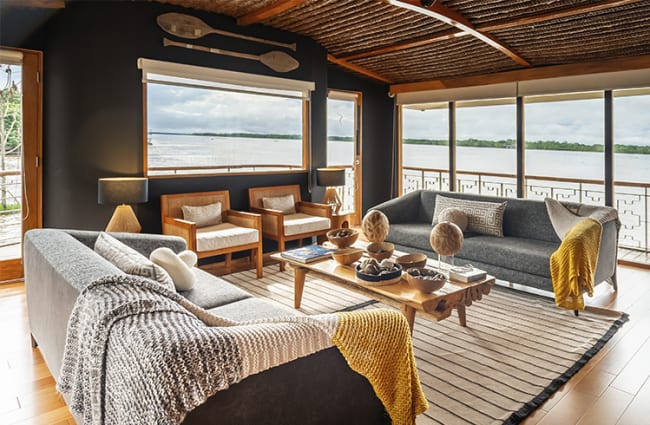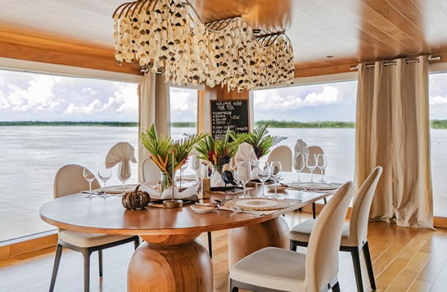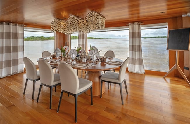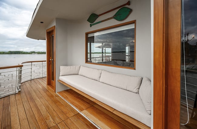But, you haven’t come to the Amazon to see the interior of a boat. Rather than enclosing you, the Delfin I brings the outdoors in with panoramic windows throughout the ship and private terraces in every suite. For an extra treat, book a Deluxe Master Suite on the lower deck with a whirlpool on the patio, where you can soak as you cruise down the river.