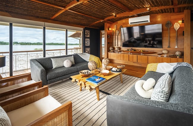 The smartly appointed interior spaces and suites aboard the Delfin I reflect the rhythms, textures, and spirit of the living Amazonian ecosystem, connecting guests more deeply to the landscape and culture they explore. Adorned with vibrant colors inspired by the region’s most treasured elements—Chambira Green, Ivory Tagua, Burgundy Açaí, and Pink Dolphin—the interiors symbolize the ship’s ongoing commitment to celebrate and protect the rainforest, and help foster an ambiance of casual sophistication.