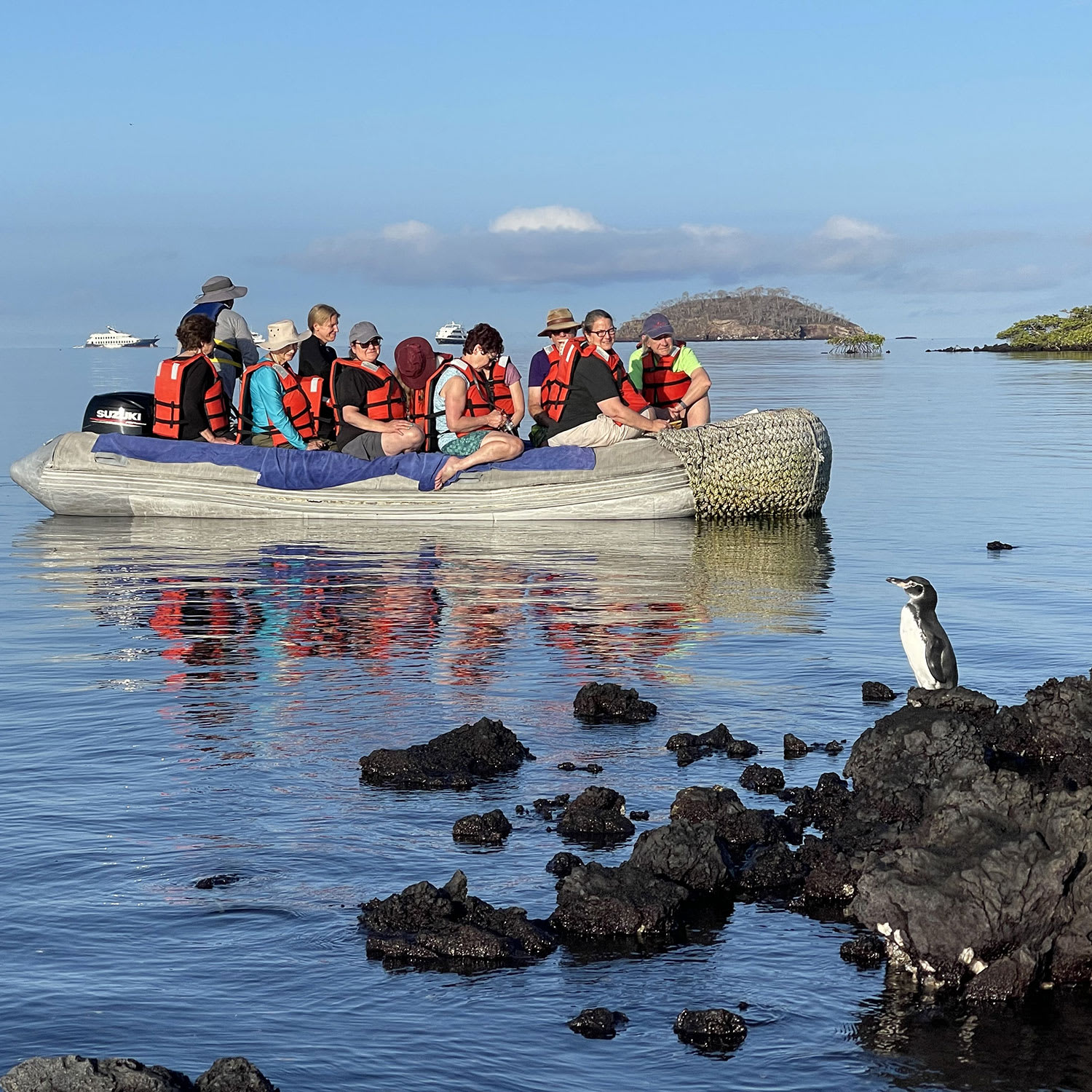 PM: Elizabeth Bay, your afternoon stop, is a sheltered bay encircled by towering mangroves and barren lava fields. There are no trails here, so you'll undertake a dinghy tour to explore the teeming channels, pools, and coves. This location is one of the finest to observe Galapagos penguins, flightless cormorants, blue-footed boobies, pelicans, rays, and sea turtles.