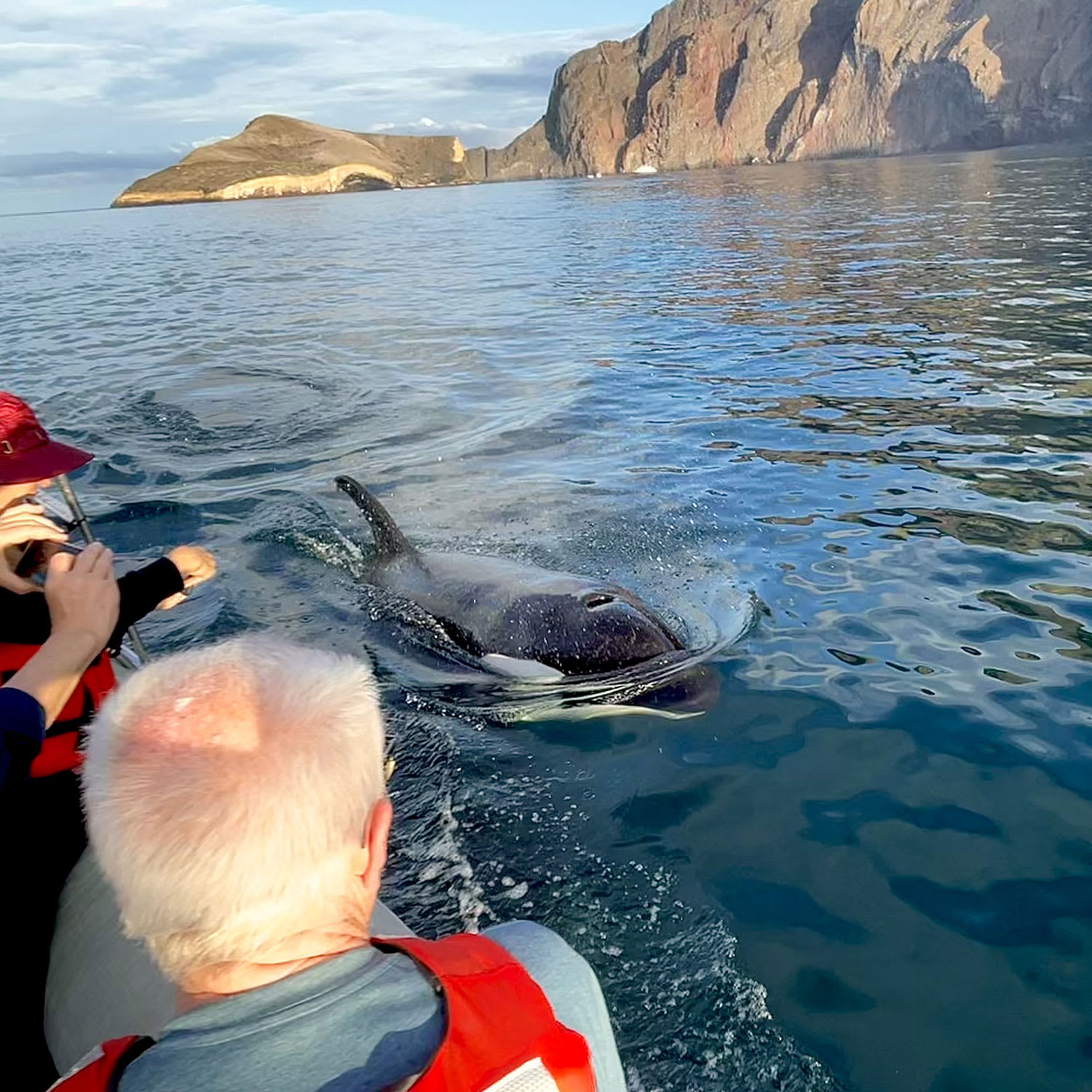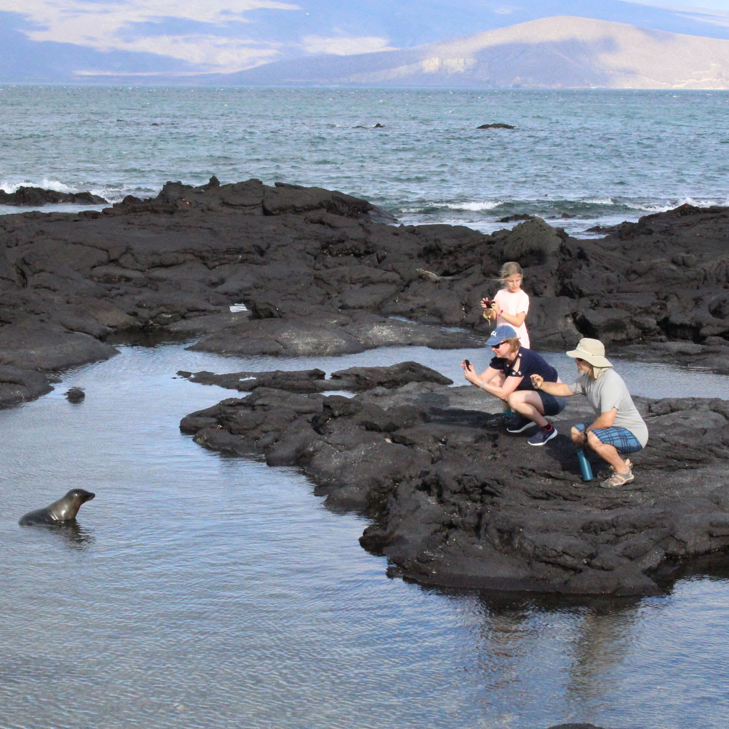 PM: Venture to Lobos Island, a tranquil islet secluded from San Cristobal by a slim channel. This nature's cradle, amidst a serene bay, is the playground for sea lion pups frolicking in tidal pools. The island might be modest but bursts with life, particularly with "lobos marinos" or sea lions. As you step ashore, welcoming committees of sea lions would greet you, only to be outraged by the male frigatebirds inland, presenting their inflamed red balloons amidst the verdant foliage. Stay vigilant for the blue-footed boobies nesting on the trails, ready to treat you to a display of their whimsical courtship dance.