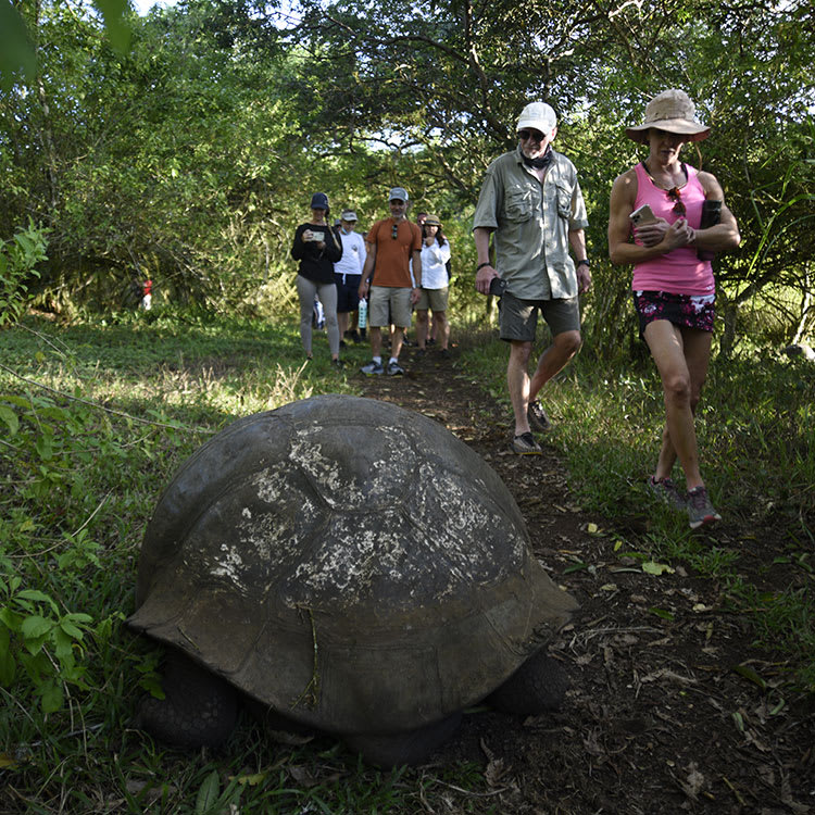 PM: Embark on a highlands adventure, either from Baltra or Puerto Ayora. A bus journey brings you to the verdant highland forests, home to Galapagos Giant tortoises. You'll find these impressive creatures, weighing up to 300 kg/600 lbs, casually grazing or lounging in freshwater ponds. The highlands also host a variety of bird species seldom seen in the lowlands. Depending on your itinerary, explore a lava tunnel and delve into the geological history of these volcanic islands.