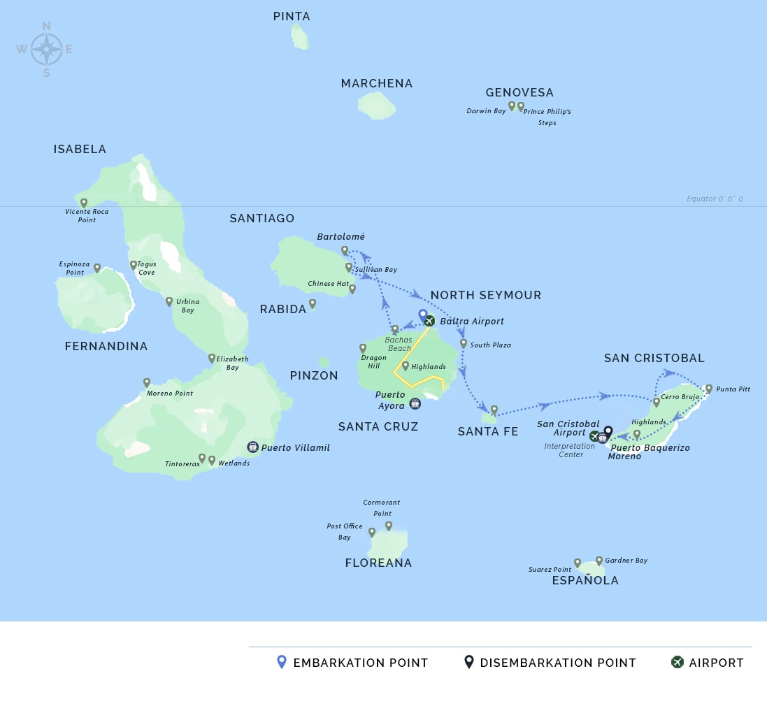 AM: Your voyage to the captivating Galapagos Islands commences! Upon your arrival at Baltra Airport, you'll be greeted by our National Park-certified naturalist guide, ready to introduce you to the unique wonders of this pristine archipelago.