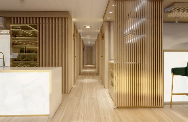 The principal deck has four cabins with balconies, an additional cabin without a balcony to the bow, the dining room, a coffee station, the living room, and the bar, plus some cozy outdoor seating to the rear. The upper deck features the bridge, behind which are four more cabins with balconies, and an alfresco area to the rear. Above it, the sun deck is the perfect location to relax and unwind with its wide solarium, Jacuzzi, and lazy chairs.