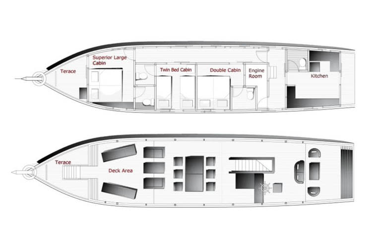 You can look forward to flavorsome Asian fusion meals, prepared on board by the accomplished cooks and eaten around the dining table on the deck. The front of the deck acts as a sun deck, where you can relax, search for wildlife and watch the emerald panoramas pass you by.
