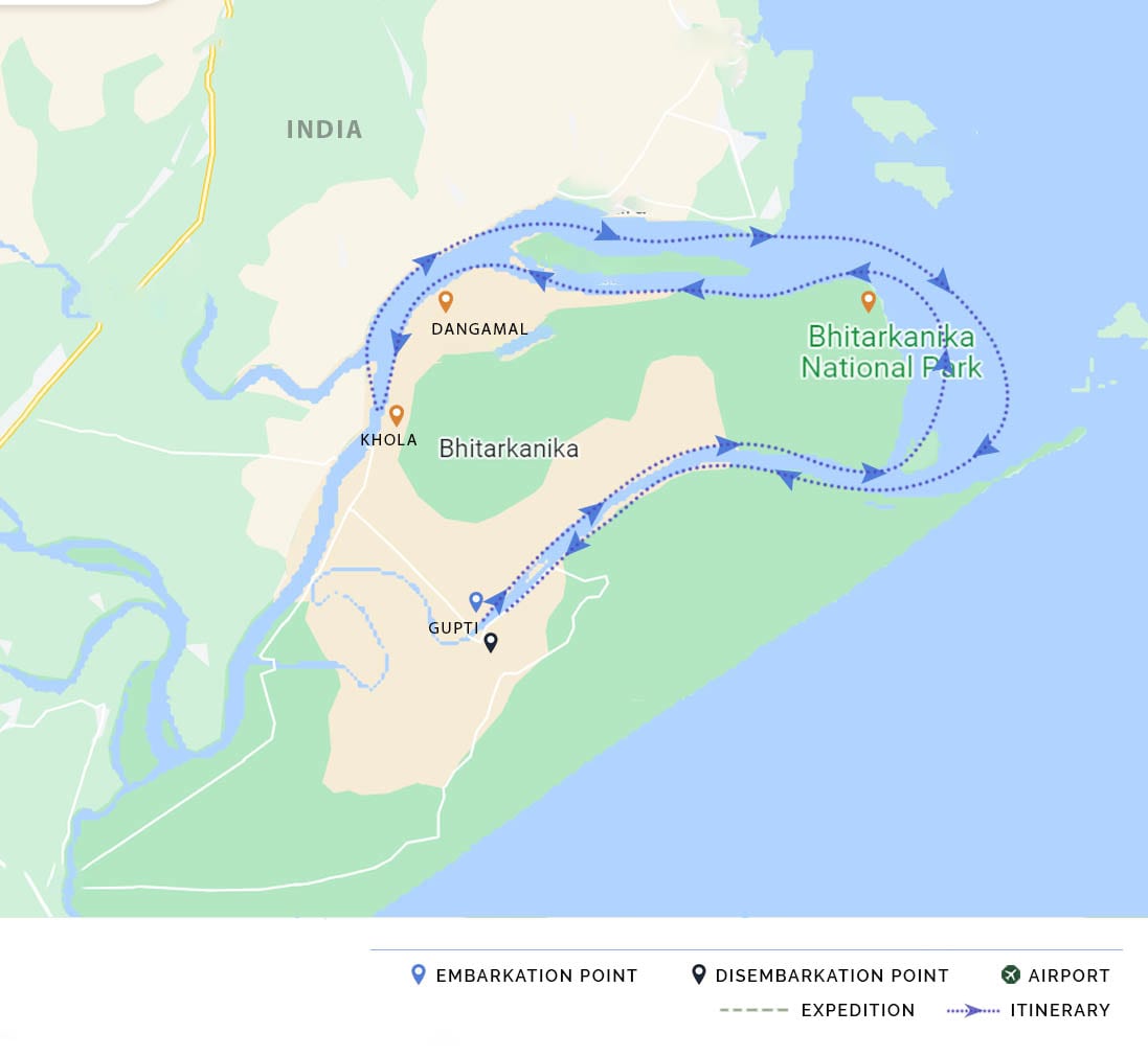 Often referred to as the mini-Amazon, the park is the second-largest mangrove ecosystem in India, lying on the coast of the Bay of Bengal. The name “Bhitarkanika” signifies outstanding beauty within, and these cruises take guests to the heart of this exceptional region, a Ramsar Site famed for its rich biodiversity, being home to endangered saltwater crocodiles, the largest colony of Olive Ridley Sea Turtles, some 320 bird species, as well as numerous reptiles, vertebrates, and mammals, including wild boar, rhesus monkeys, otters, sambar deer, wolves, and fishing cats.