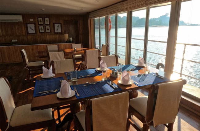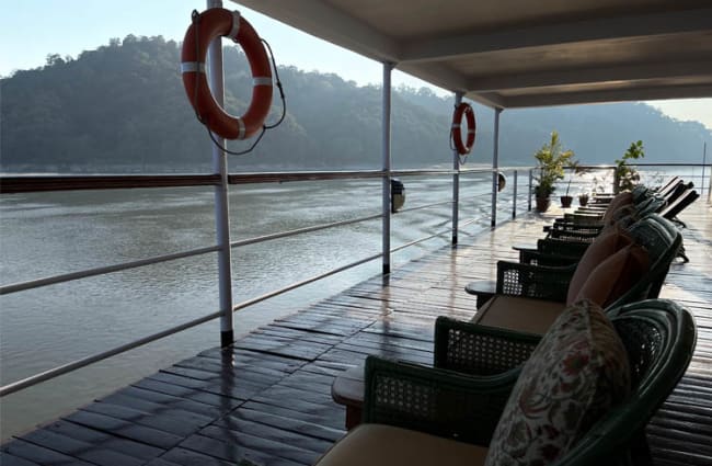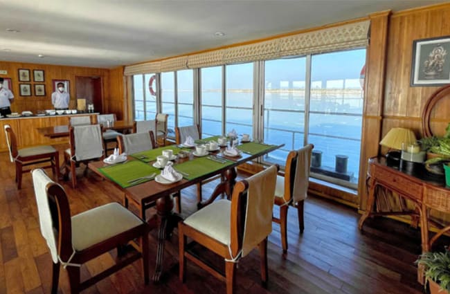 The ship’s interior celebrates local craftsmanship, featuring cane furniture, local objet d’arts, and handlooms made by talented artisans from Assam. This commitment to local artistry imbues the ship with a warm, authentic character. Guests stay in airy, bamboo-paneled upper deck cabins, all featuring large sliding windows and en suite bathrooms.