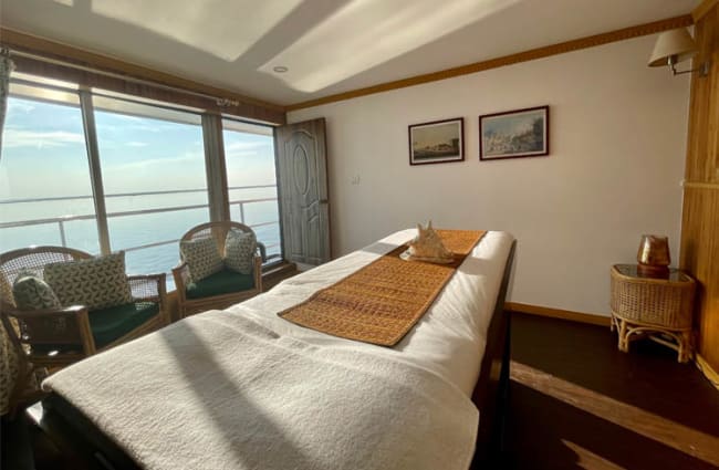 To support the conservation of India’s forests, the upper deck cabins are constructed with bamboo paneling, reflecting a commitment to sustainability. Positioned on the highest accommodation deck, these cabins grant convenient access to the neighboring saloon, while the large, sliding windows ensure continuous panoramic views of the Brahmaputra. Each cabin is well-equipped with en suite shower/WC featuring Kama Ayurveda toiletries, generous storage, and high-quality linens.