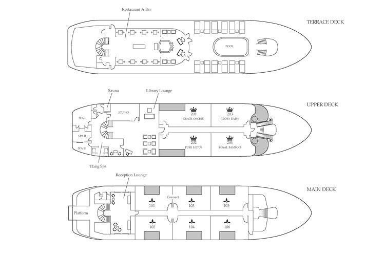 The facilities aboard Ylang include a heated jacuzzi-pool perched under the shadows of the ship’s triple sails on the uppermost Terrace Deck, a cozy indoor library lounge and the distinctively Indochinese-styled restaurant with adjacent bar evoking the grand days of old Indochina.