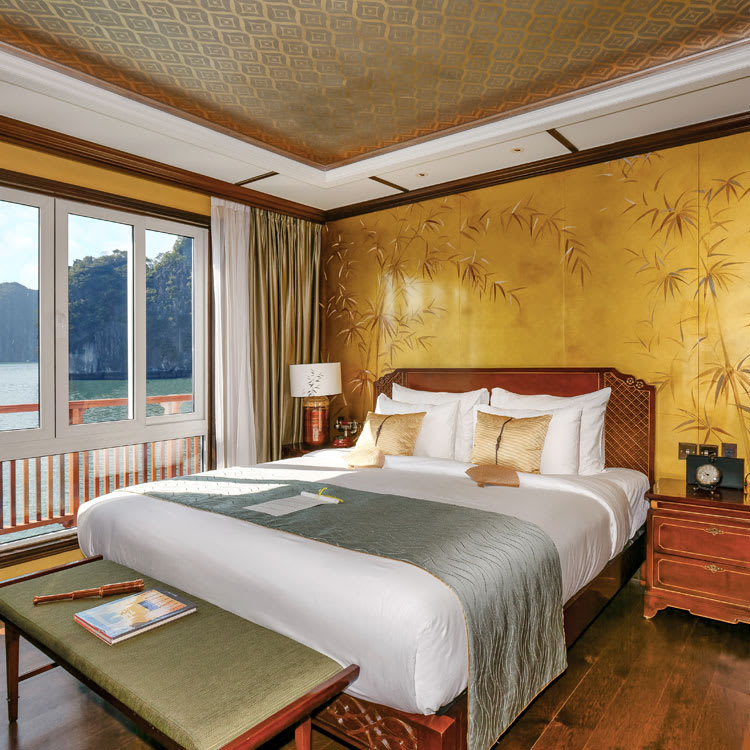 Glory Daisy & Royal Bamboo are the most premium accommodations on board and sit in a prime location at the bow of the ship. Both are also individually designed and include a separate bedroom and sofa lounge area which grants access to the front-facing private balcony with outdoor Jacuzzi. The elegant bathrooms are outfitted with walk-in showers and free-standing bathtubs with splendid views of the bay.